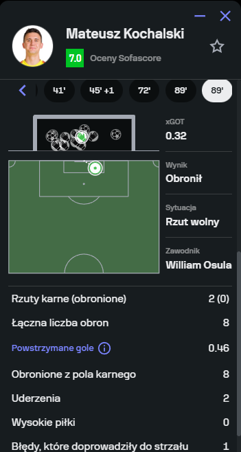 Несмотря на поражение со счетом 1:6, у Матеуша Кохальского наверняка есть причины для удовлетворения. По версии Sofascore, представитель Польши стал лучшим игроком Карабаха с результатом 7,0. Поляк отразил целых восемь бросков, что определенно помогло избежать еще большего поражения.