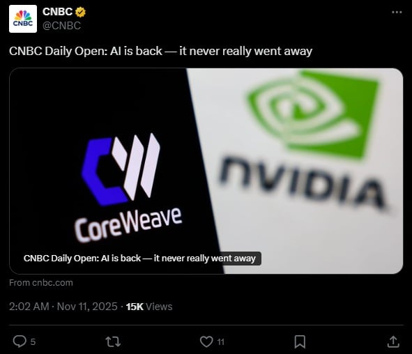 CoreWeave прогнозирует выручку в 2025 году на уровне $5,05–5,15 млрд. Это меньше прогнозов аналитиков в $5,29 млрд. После этих данных акции компании потеряли на бирже около 6% за несколько часов.