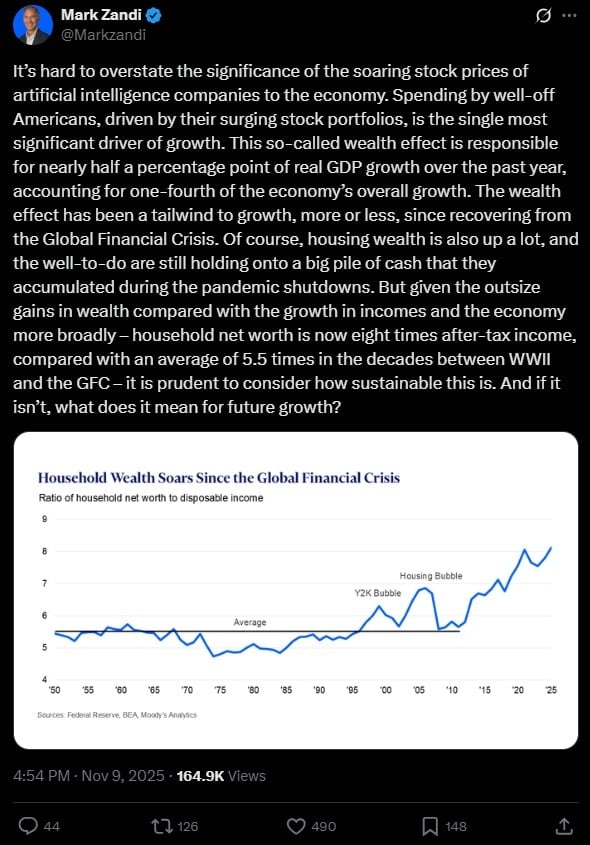Марк Занди заметил интересную связь. Главный экономист Moody’s Analytics отметил, что рост цен на акции компаний, занимающихся искусственным интеллектом, сыграл ключевую роль в стимулировании экономического роста США. Эксперт отметил, что увеличение благосостояния домохозяйств в результате роста фондовых рынков стимулировало потребительские расходы.