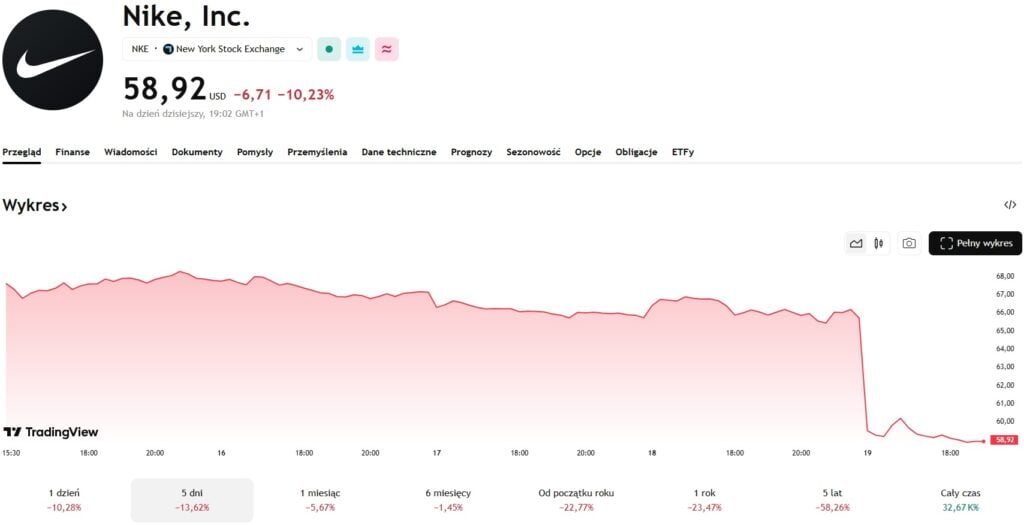 В пятницу, 19 декабря, акции компании оценивались в $58, хотя несколькими часами ранее они стоили почти $67. Всего за хороший период времени гигант потерял на бирже около 10%. При этом в недельном исчислении убыток составил 13,62%. Однако в месячном исчислении гигант упал на 5,72%. Индикатор YTD (год к дате) в последнее время также значительно снизился. С начала года Nike потерял более 20% своей стоимости.