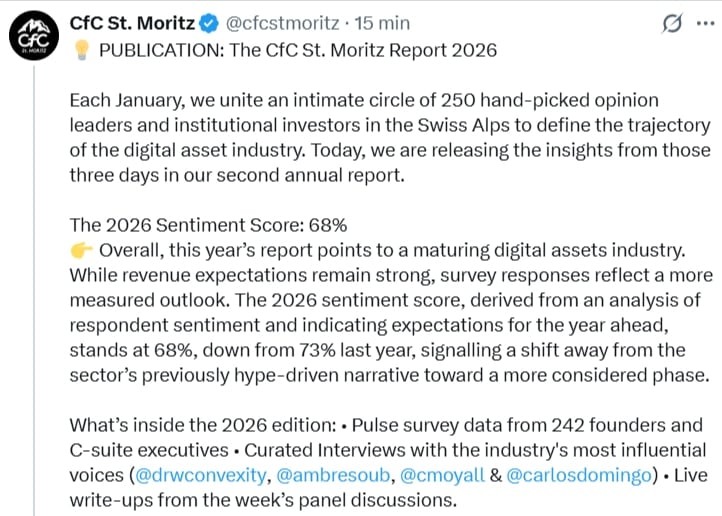 Отчет CfC St. Moritz показывает, что количество людей, которые верят в огромный успех публичных размещений акций, сокращается на несколько процентных пунктов в год. Вместо этого внимание политиков переключается на внутренние технологии и стабильность регулирования как основу для следующей волны роста. Американский рынок, который недавно был признан худшим с точки зрения регулирования, поднялся на второе место в рейтинге дружелюбности к инвесторам. Это результат введения новой правовой базы, которая, по мнению аналитиков JPMorgan, может подтолкнуть цену биткойна примерно до 170 000 долларов США, если фонды будут относиться к этому активу наравне с золотом.