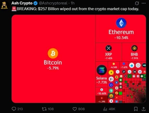 Предыдущая неделя прошла достаточно спокойно и даже давала надежду на отскок после лучших результатов многих токенов. Однако эта неделя началась с огромного падения. Красный цвет доминировал на всех графиках. Криптовалюты переживают огромный кризис, и похоже, что быстрого восстановления после краха не будет. Биткойн вчера упал ниже 100 000. Доллар США и альткойны последовали этому примеру. Весь рынок потерял сотни миллиардов долларов за один день.