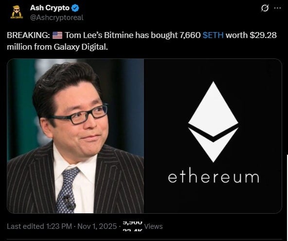 Том Ли все еще верит в Эфириум. BitMine регулярно увеличивает свои ресурсы