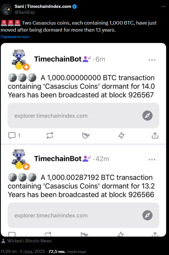 В пятницу, 5 декабря, были активированы две физические монеты Casascius, каждая из которых содержала 1000 биткойнов. Это привело к разблокированию активов на сумму более 179 миллионов долларов, которые оставались нетронутыми более 13 лет. Об этом сообщает CryptoRank.io.