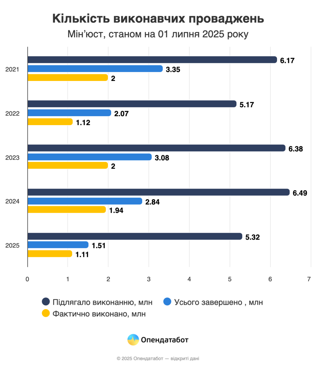 В первом полугодии 2025 года с каждой гривны долга в Украине фактически было собрано менее 1 копейки. На фоне резкого увеличения числа трудноисполнимых дел эффективность правоприменения упала до минимума, сообщает Opendatabot.