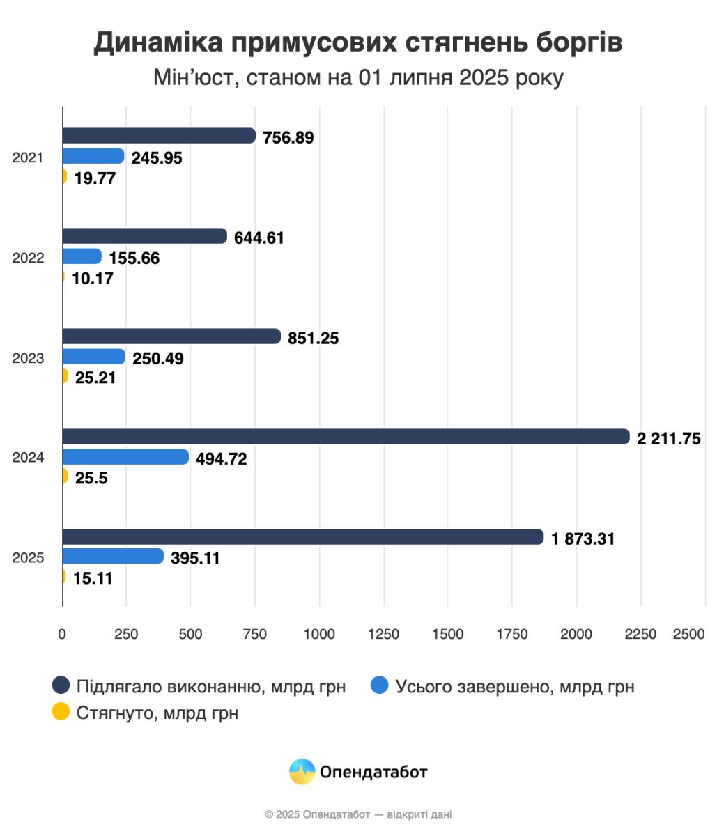 В первом полугодии 2025 года с каждой гривны долга в Украине фактически было собрано менее 1 копейки. На фоне резкого увеличения числа трудноисполнимых дел эффективность правоприменения упала до минимума, сообщает Opendatabot.