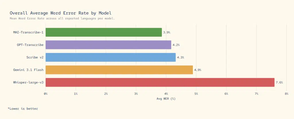 Система транскрипции речи Microsoft называется MAI-Transcribe-1. По заявлению компании, она допускает значительно меньше ошибок транскрипции, чем конкурирующие системы. MAI-Transcribe-1 поддерживает 25 языков со всего мира и, если верить Microsoft, превосходит OpenAI Whisper-large-v3 в каждом из них. Однако по сравнению с Google Gemini 3.1 Flash выигрывает на 22 из 25 языков.