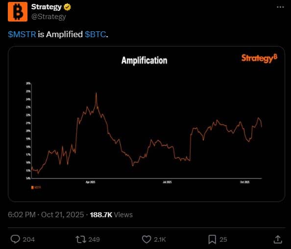 В начале недели MicroStrategy подала важный сигнал. 20 октября компания объявила на X, что приобрела 168 биткойнов примерно на 112 000 злотых. долларов США за штуку. После этих покупок по состоянию на 19 октября 2025 года у компании было 640 418 BTC. Всего на все токены гигант потратил 47,40 млрд долларов США. Средняя цена, по которой MSTR приобрела каждый биткойн, составляет 74 010 долларов США.