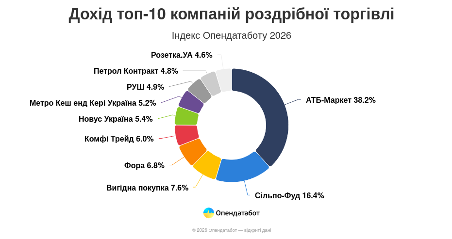 Совокупная выручка компаний розничной торговли, вошедших в Индекс Опендатабота 2026, достигла 647,33 млрд грн. Для сравнения: это на 22% больше результатов лидеров предыдущего индекса. Чтобы попасть в десятку, компаниям пришлось преодолеть новый финансовый барьер, за год вырос с 20 млрд грн до 30 млрд грн.