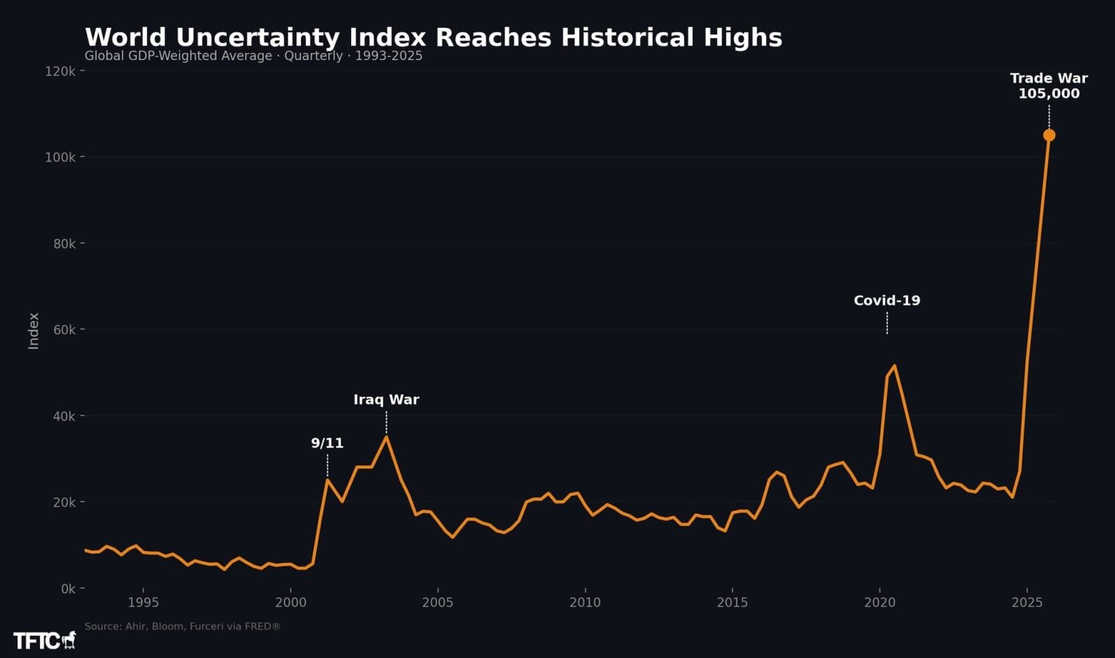 Уровень глобальной экономической и политической тревоги достиг беспрецедентных масштабов. Мировой индекс неопределенности (World Uncertainty Index, WUI) взлетел до отметки более чем в 106 000 пунктов, что является абсолютным рекордом за всю историю наблюдений (с 1993 года). Этот показатель паники на рынках оказался хуже времен пандемии COVID-19, терактов 11 сентября, войны в Ираке и глобального финансового кризиса 2008 вместе взятых.