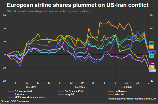 Акции туристического рынка упали в понедельник, поскольку эскалация конфликта между США, Израилем и Ираном нарушила авиасообщение по всему миру, заставила закрыть ключевые ближневосточные транспортные узлы и привела к резкому росту цен на нефть, причем аналитики предупреждают о неделях перебоев, пишет Reuters.