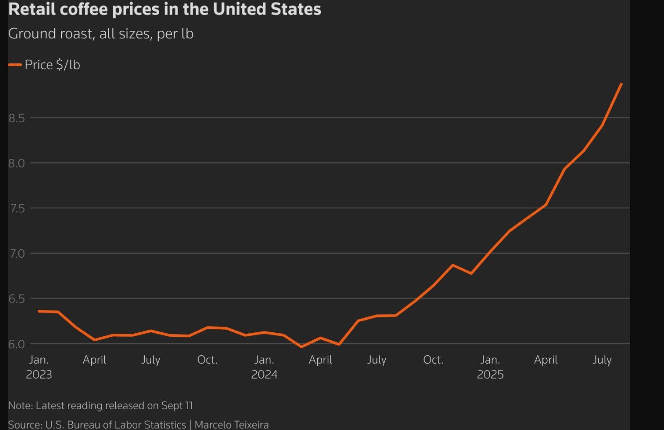 В США розничные цены на кофе в сентябре выросли на 40% по сравнению с аналогичным периодом прошлого года, отчасти из-за тарифов. Рост цен на продукты питания является одним из ключевых факторов, почему рейтинги одобрения Трампа упали до самого низкого уровня с момента его вступления в должность.