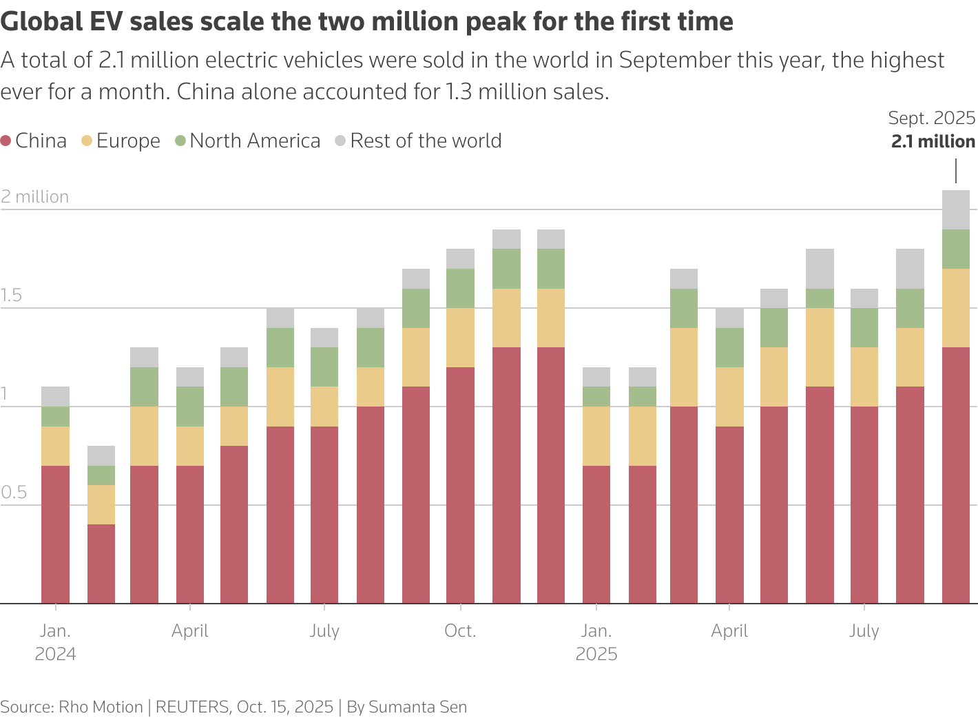 В сентябре 2025 года мировые продажи полностью электрических и гибридных автомобилей (PHEV) выросли на 26% по сравнению с аналогичным периодом прошлого года и достигли рекордных 2,1 миллиона единиц. Этот быстрый рост был обусловлен высоким спросом в Китае и стремлением покупателей в США воспользоваться налоговыми льготами. Об этом сообщает Reuters со ссылкой на данные исследовательской компании Rho Motion.