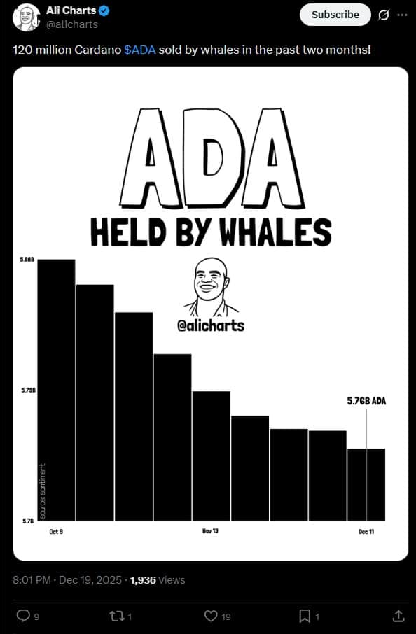 Али Мартинес опубликовал последние данные об активности китов в районе Кардано, и они не очень оптимистичны. В одном из своих последних постов на X Мартинес объявил, что что киты продали целых 120 миллионов штук ADA за последние два месяца. Данные, распространенные экспертом, взяты с известной аналитической платформы «Сантимент».