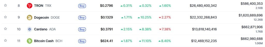 Цена Кардано продолжает падать. Токен близок к выпадению из ТОП-10. Займет ли его место Bitcoin Cash?