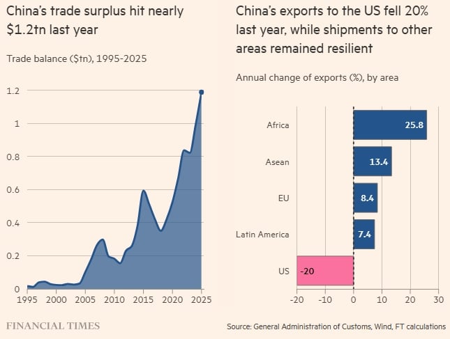 Торговый профицит Китая в прошлом году составил почти 1,2 трлн долларов. Торговый баланс (трлн долл. США), 1995-2025 г.г. Экспорт Китая в США в прошлом году сократился на 20%, в то время как поставки в другие регионы оставались стабильными. Годовая смена экспорта (%) в регионах. FT.