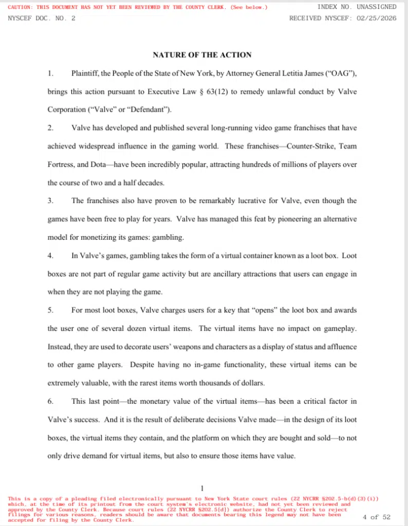 Тот факт, что азартные игры тесно связаны с играми Valve, не привлек внимание прокуратуры Нью-Йорка. Прокурор решил подать в суд на компанию за пропаганду нелегальных азартных игр. На протяжении всего письма, которое содержит целых 52 страницы, мы можем прочитать, что, по мнению прокуратуры, Valve нашла способ монетизировать игры посредством игр, а точнее лутбоксов. В письме можно прочитать, что предметы из лутбоксов не влияют на игровой процесс и носят лишь декоративный характер.