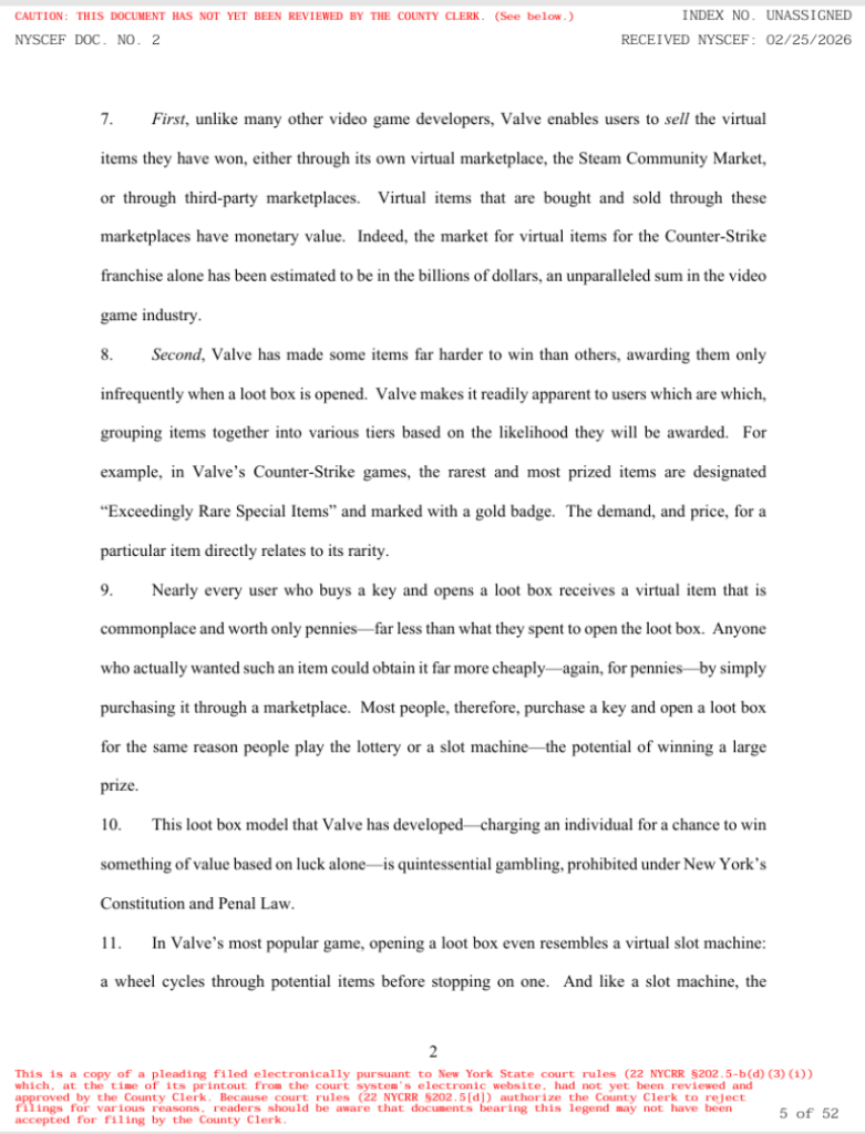 В любом случае, изучив весь документ (который вы можете найти здесь), мы узнаем, что несанкционированные азартные игры являются незаконными в Нью-Йорке, и, разрешив их, Valve нарушила статью I Конституции Нью-Йорка и разделы 220.05 и 220.10 Уголовного закона Нью-Йорка.