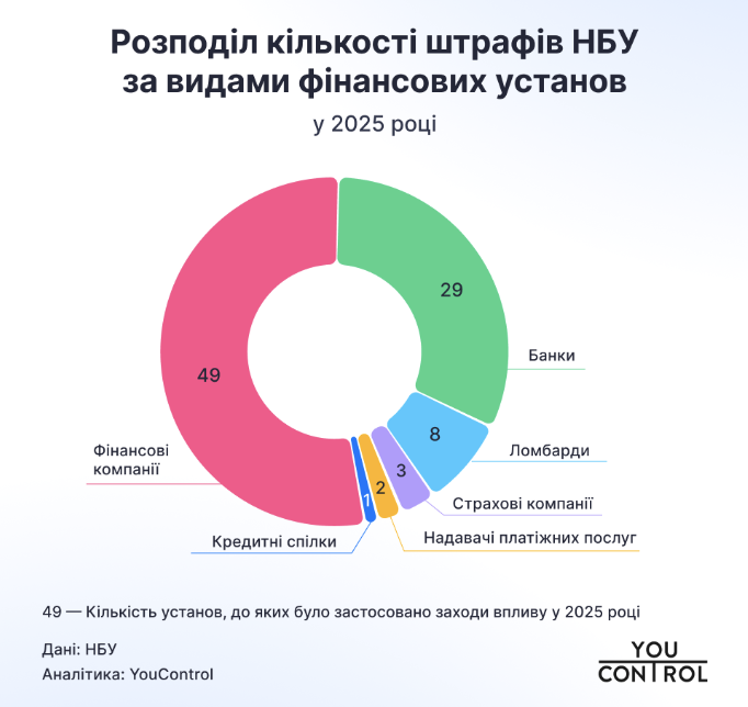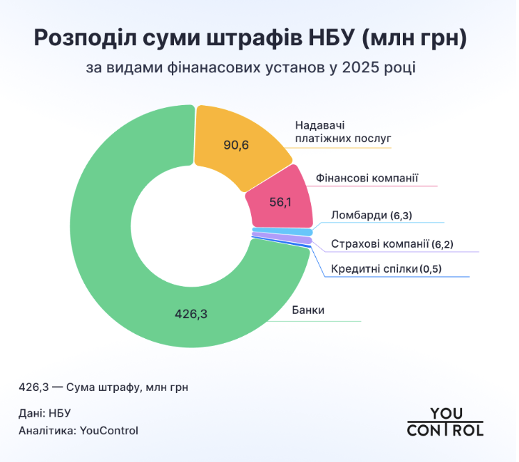 Абсолютными лидерами по сумме уплаченных штрафов в 426,3 млн. грн. украинские банки. На них пришлось более 72% всех финансовых взысканий в прошлом году. В общей сложности под жесткие меры влияния Нацбанка в 2025 году попали 29 банков, в отношении которых вынесено 71 решение о мерах влияния.