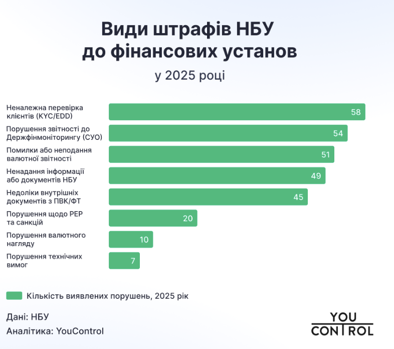 Специалисты YouControl обнаружили, что абсолютным лидером среди причин применения мер воздействия стала ненадлежащая проверка клиентов (KYC) и отсутствие углубленной проверки (EDD). За год НБУ зафиксировал 58 таких нарушений. Финансовые учреждения часто не могли объяснить экономическую сущность транзакций своих клиентов, не учитывали непрозрачность источников происхождения их средств или не устанавливали адекватный уровень риска. Для регулятора это ключевой маркер потенциального отмывания денег, поэтому именно за игнорирование базового правила «знай своего клиента» назначались самые строгие финансовые меры воздействия.