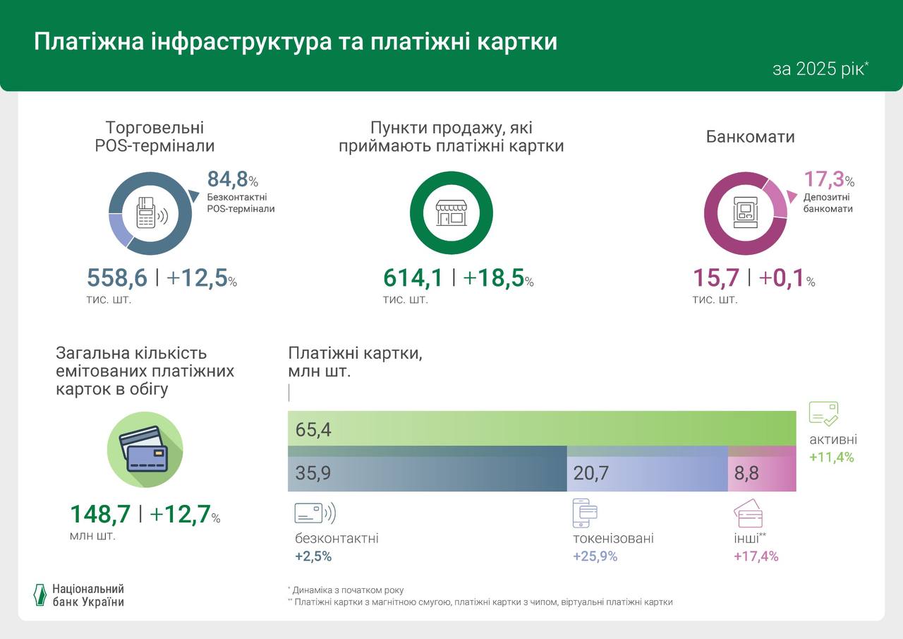 В прошлом году увеличилось общее количество платежных карт, эмитированных украинскими банками и финансовыми учреждениями. По состоянию на 1 января 2026 года их количество достигло 148,7 млн. Это на 12,7% больше по сравнению с итогами 2024 года. Об этом говорится в сообщении регулятора.