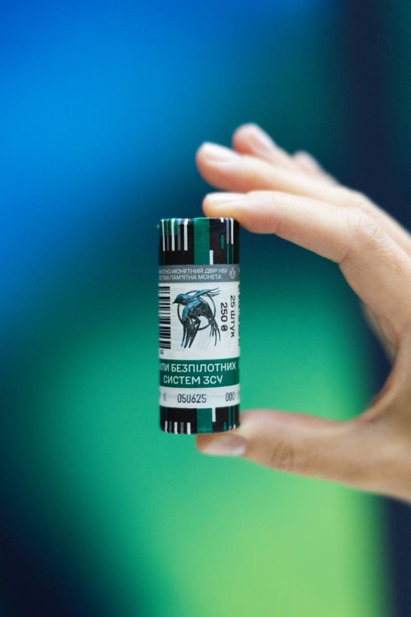 В то же время, часть циркуляции циркулирующей мемориальной монеты «Силы беспилотных систем вооруженных сил Украины» будут сформированы в специально украшенных роликах. Ролик будет содержать 25 циркулирующих мемориальных монет. На сувенирной бумаге, которая наполнена каждым валиком, изображает стальную ласточку, эмблему беспилотных сил вооруженных сил Украины, на фоне стилизованных воздушных потоков. Циркуляция роликов — 20 тысяч единиц.