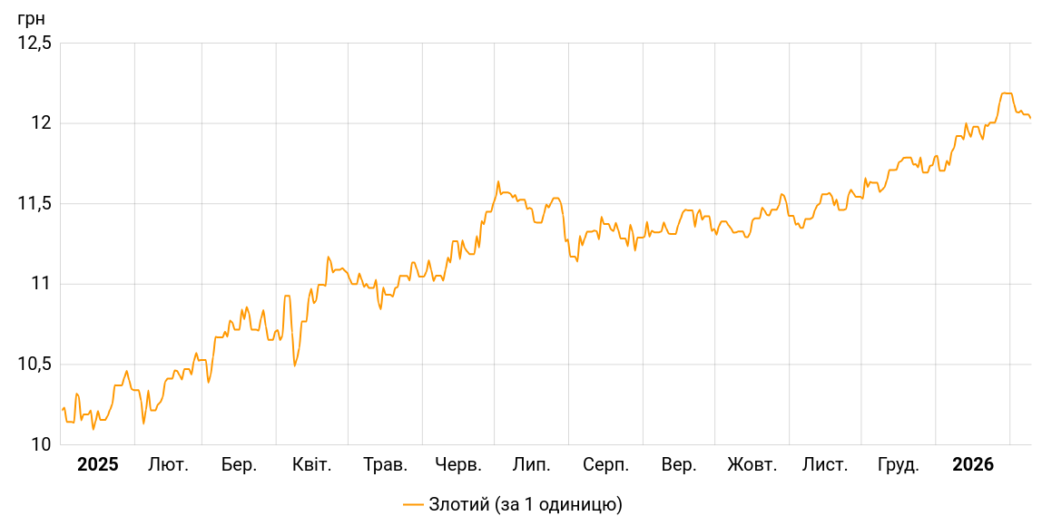 Анализ колебаний курса за период с начала 2025 года по февраль 2026 года показывает уверенное лидерство польского злотого. В начале 2025 года официальный курс составлял 10,20 гривны за один злотый. Пика валюта достигла 29 января 2026 года, достигнув 12,19 гривны.