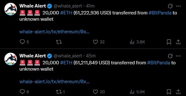 Среди них обращают на себя внимание, в частности: два перевода от BitPanda. Один кит совершил две транзакции по 20 000 каждая. ETH, перевод токенов с криптовалютной биржи на частные кошельки. Это говорит о том, что крупные держатели не видят необходимости продавать Ethereum, а предпочитают хранить его в более безопасном месте, чем биржи.