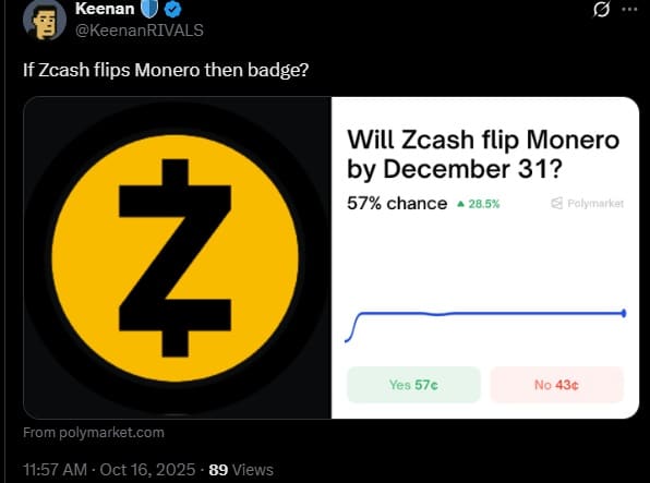 В свою очередь, популярный аналитик, работающий под псевдонимом Кинан, опубликовал прогноз, согласно которому ZEC имеет 57% шанс превзойти Monero к концу года. Эндрю Арнотт, еще один эксперт рынка криптовалют, также видит реальные шансы у Zcash обойти Monero, который является его основным конкурентом в сегменте токенов конфиденциальности.