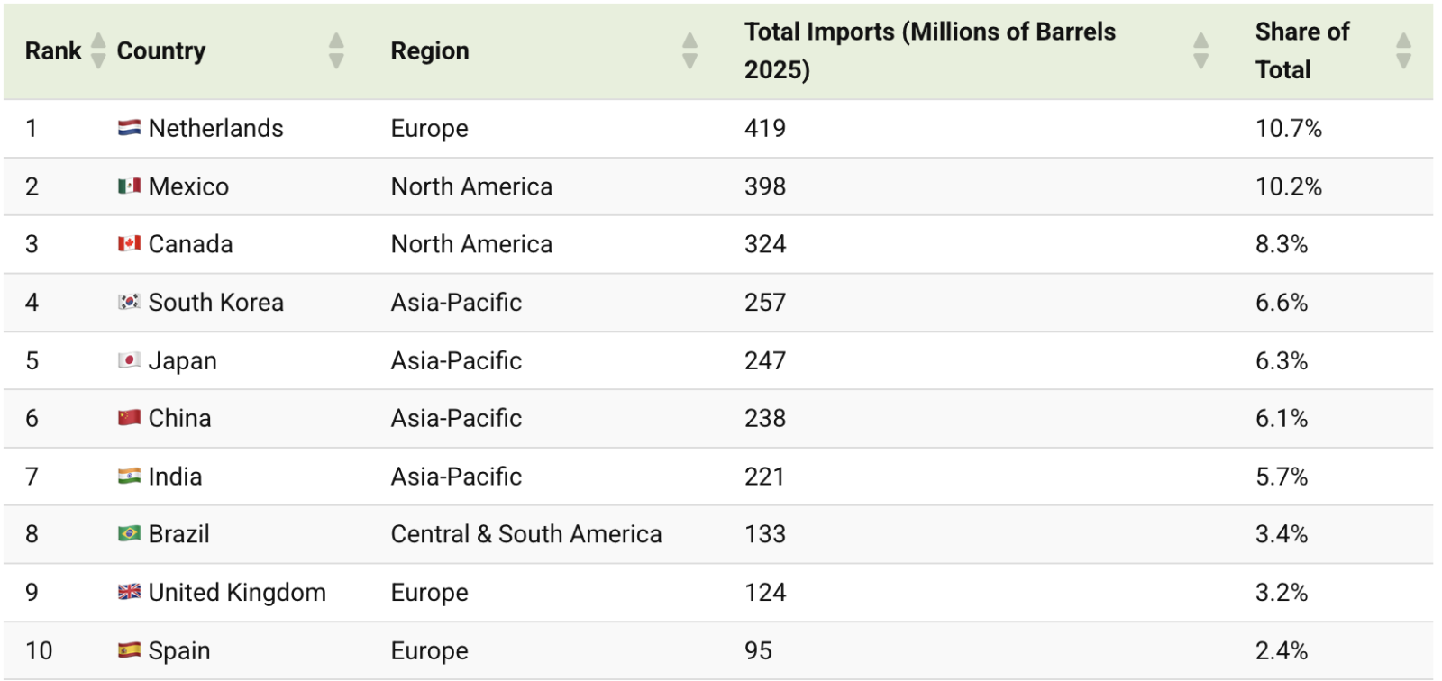 Кроме Нидерландов, активными покупателями в Европе остаются Великобритания (124 млн баррелей) и Испания (95 млн баррелей), замыкающие первую десятку. В Латинской Америке ключевым игроком стала Бразилия, которая импортировала 133 миллиона баррелей, заняв 8 место в мире.