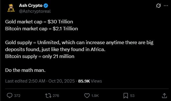 Эш Критпо, популярный в социальных сетях аналитик финансового рынка, в одном из своих последних постов на X сравнил оба продукта, что показывает превосходство BTC над золотом.