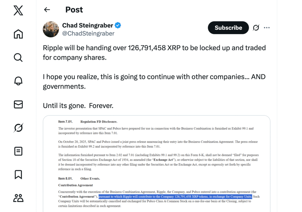 Ripple должен пройти дальше 126 791 458 токенов XRP в рамках крупной корпоративной сделки. Подробности были раскрыты в недавнем отчете регулирующих органов, касающемся слияния Evernorth Holdings и Armada Acquisition Corp. II.
