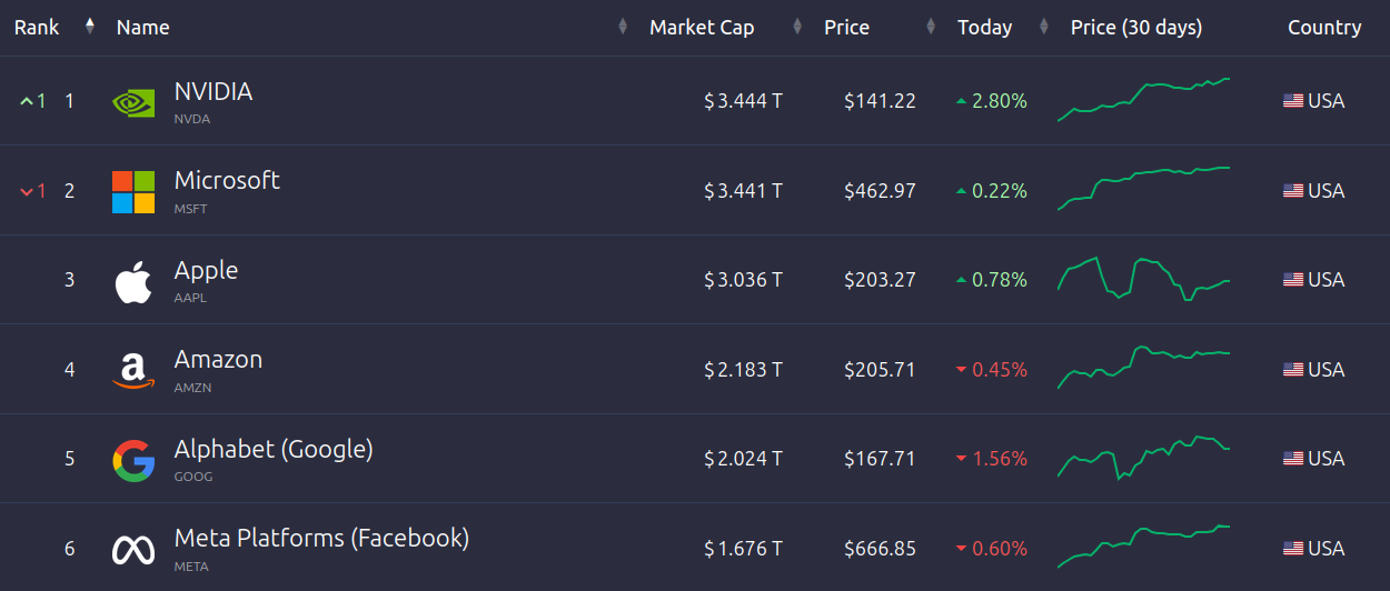 Согласно результатам NVIDIA, он достиг капитализации в 3,444 триллиона долларов, опередив Microsoft с 3,441 триллионом долларов. С июня 2023 года NVIDIA периодически появляется на первом месте, чередуясь с Apple и Microsoft. Нвидия в последний раз возглавляла рейтинг 24 января.