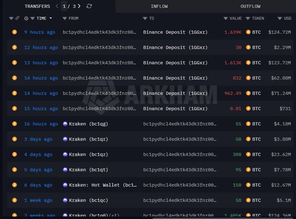 Данные, предоставленные платформой анализа данных блокчейна Arkham Intelligence, показывают, что инвестор накапливал биткойны в основном через биржу Kraken, заплатив в среднем около 99 000 злотых. долларов за монету. Решение о продаже было принято, когда курс BTC упал ниже 77 000. долларов, что совпало с растущей нервозностью на американских фондовых рынках. Большая часть средств ушла на депозиты биржи Binance, а отдельные переводы достигли 962 штук BTC, то есть примерно по $71 млн каждый. В истории кошелька также показаны свежие депозиты от Kraken, в том числе 300 BTC всего за несколько дней до общей суммы.