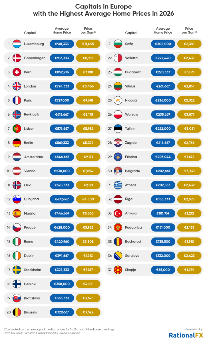 По данным Rational FX, рейтинг столиц с высокими ценами на жилую недвижимость в 2026 году выглядит так: