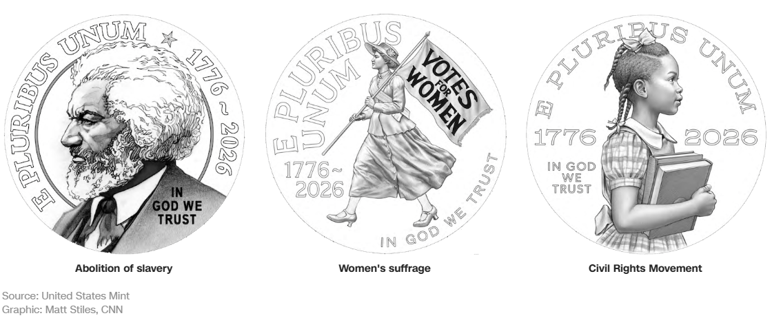 Вместо рекомендованных ранее четвертаков (25-центовая монета), посвященных отмене рабства, избирательному праву женщин и Движению за гражданские права, Минфин планирует выпустить памятные четвертаки с изображениями исторических деятелей XVIII и XIX веков. В основном это фигуры, которые уже широко представлены на американской валюте и в официальных исторических памятниках.