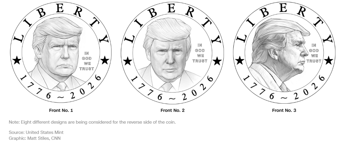 Выпуск спорной долларовой монеты с изображением действующего президента также является частью плана Министерства финансов. Монетный двор США выпустил три различных предложенных дизайна монет с портретами Трампа.