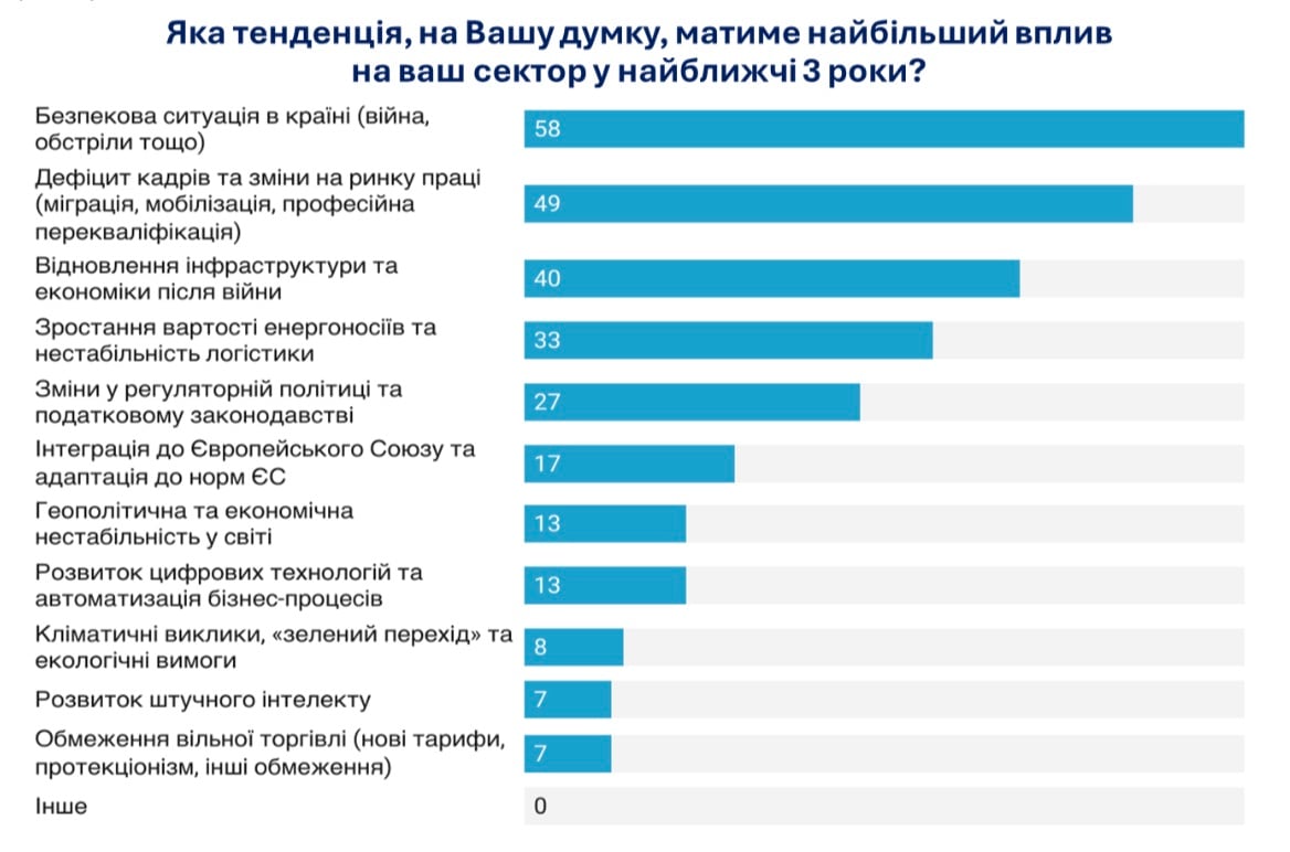 Предприниматели ожидают, что ситуация с безопасностью в Украине окажет наибольшее влияние на их сектора в ближайшие три года — фактор войны, обстрел и угрозы для физической инфраструктуры отметил 58% респондентов. Об этом свидетельствуют результаты 38 -го ежемесячного опроса, которое он провел Институтом экономических исследований и политических консультаций (IED) в июне 2025 года среди 473 промышленных предприятий.