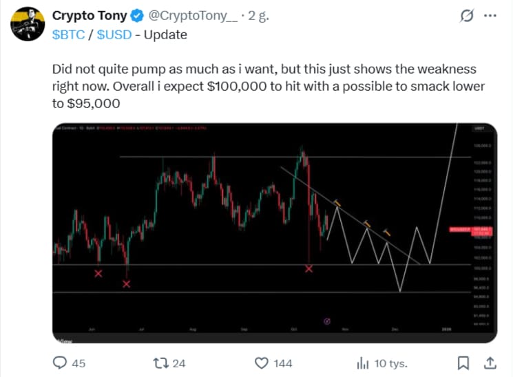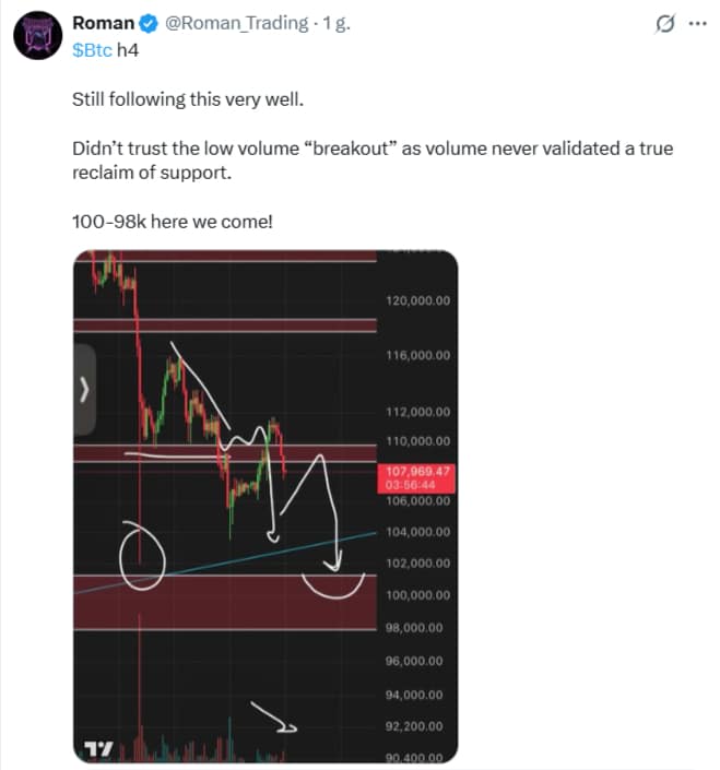 Некоторые трейдеры готовятся к новым локальным минимумам, включая прорыв поддержки в 100 000 долларов. Трейдер Роман утверждал на платформе X, что он не доверяет отскоку низкого объема, поскольку он никогда не подтверждал истинного восстановления поддержки. По его мнению, на очереди уровень $100 000 – $98 000.