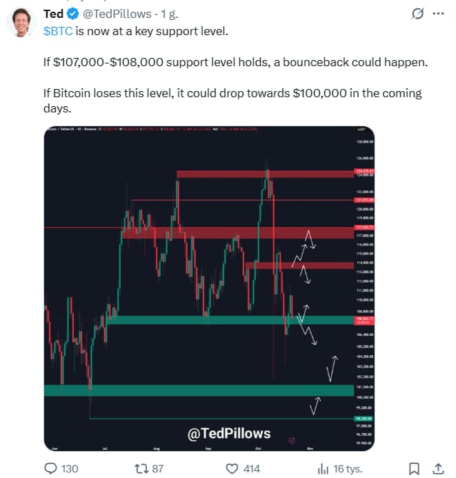 Инвестор Тед Пиллоуз разделяет аналогичную точку зрения и также рассматривает $100 000 в качестве следующего ключевого уровня, если Биткойн не сможет достичь устойчивого дна.