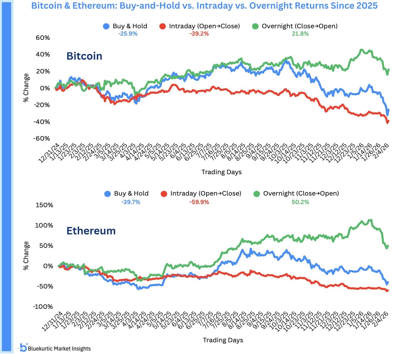 Аналитики разделили доходность двух главных криптовалют – Bitcoin и Ethereum – на два периода: «внутридневный» (Intraday, от открытия до закрытия торгов) и «ночной» (Overnight, от закрытия до открытия). Результаты с начала 2025 года оказались потрясающими: