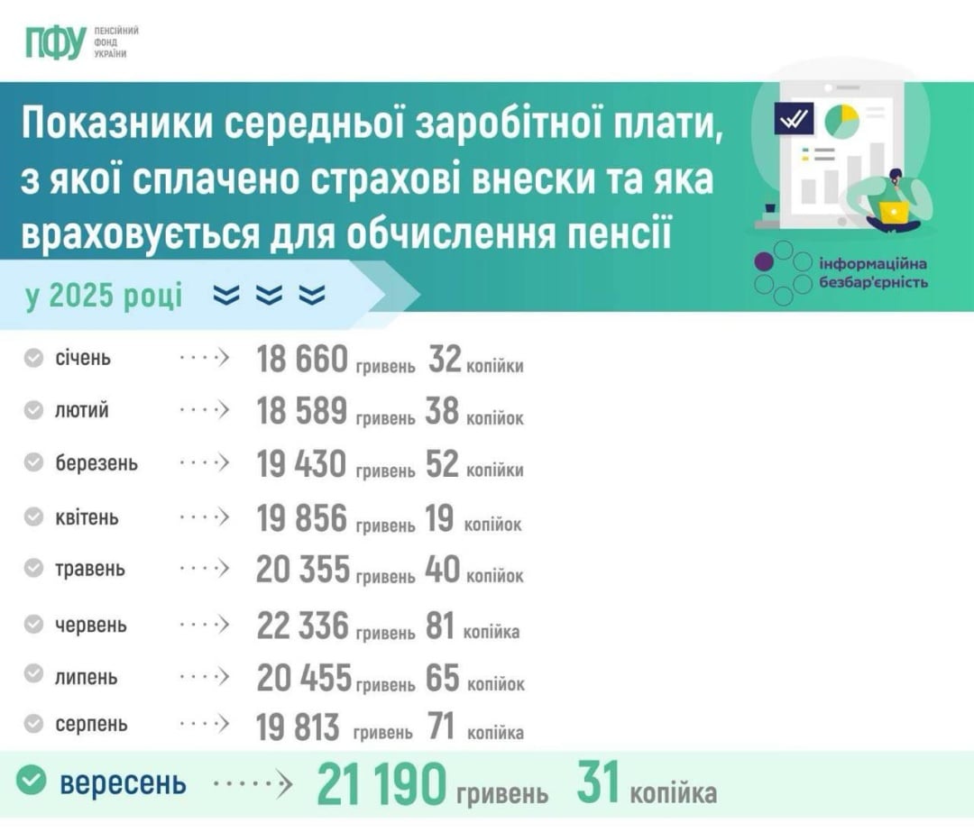 «27 октября 2025 года показатель средней заработной платы (дохода) в Украине, из которого уплачиваются страховые взносы и который в соответствии с Законом Украины «Об обязательном государственном пенсионном страховании» учитывается при расчете пенсии, утвержден на сентябрь 2025 года. Он составляет 21 190 гривен 31 копейка», — говорится в сообщении.