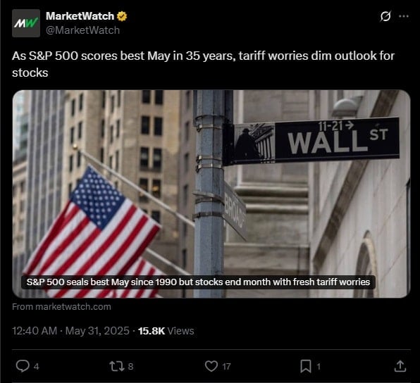 В последние недели рынки возродились в основном из -за облегчения напряженных отношений между Вашингтоном и Пекином. В начале мая обе стороны решили, что они приостанавливают свои взаимные обязанности на 90 дней. Однако последняя неделя мая снова вызвала беспокойство на финансовых рынках.