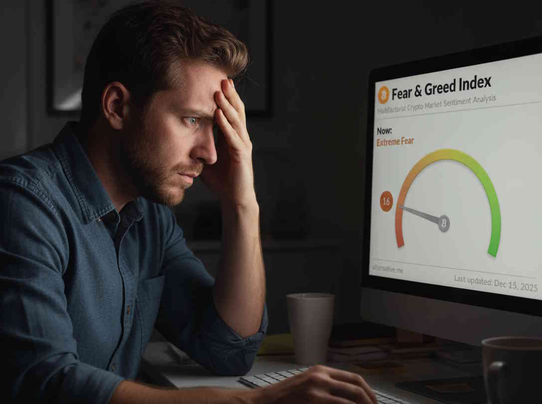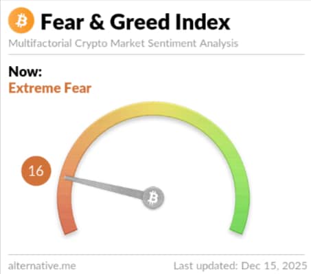 Крипто-индекс страха и жадности снова погрузился в зону крайнего страха, достигнув 16 пунктов.