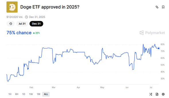 По словам участников, фонд ETF Dogecoin (Doge) дебютирует в этом году. Платформа прогнозирования, основанная на криптовалютах, оценивает вероятность того, что американский регулятор предоставит продукту зеленый свет продукту до 31 декабря 2025 года, в 23:59 восточного времени, на 75%.