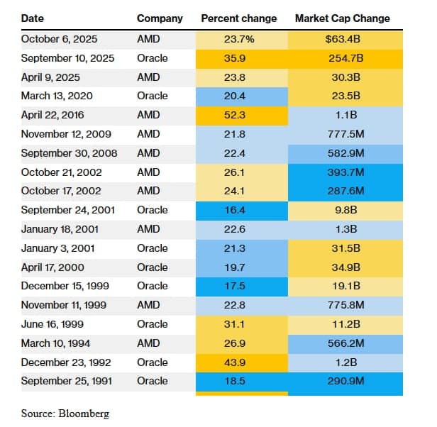Дело не только в самих цифрах – хотя они впечатляют. Быстрый рост цен крупных, зрелых компаний необычен. В случае с AMD и Oracle мы увидели, как за одну сессию их рыночная стоимость увеличилась на 60 и 250 миллиардов долларов соответственно. Это движения, о которых десять лет назад никто бы и не слышал, но сегодня они подпитывают повествование о большом пузыре.