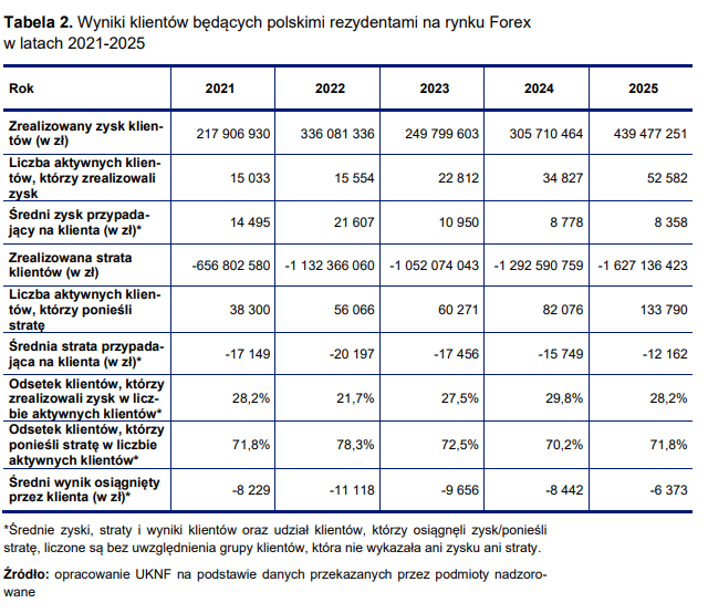 Самое поразительное — масштабы исчезновения с рынка денег индивидуальных инвесторов и других клиентов. Общая реализованная прибыль всех клиентов увеличилась до 740 миллионов злотых в 2025 году с 475 миллионов злотых годом ранее. В то же время общий реализованный убыток увеличился с 2,08 млрд злотых до 2,68 млрд злотых. Именно эта взаимосвязь показывает, что даже когда количество людей с положительными результатами увеличивается, баланс всего рынка остается явно неблагоприятным для клиентов.