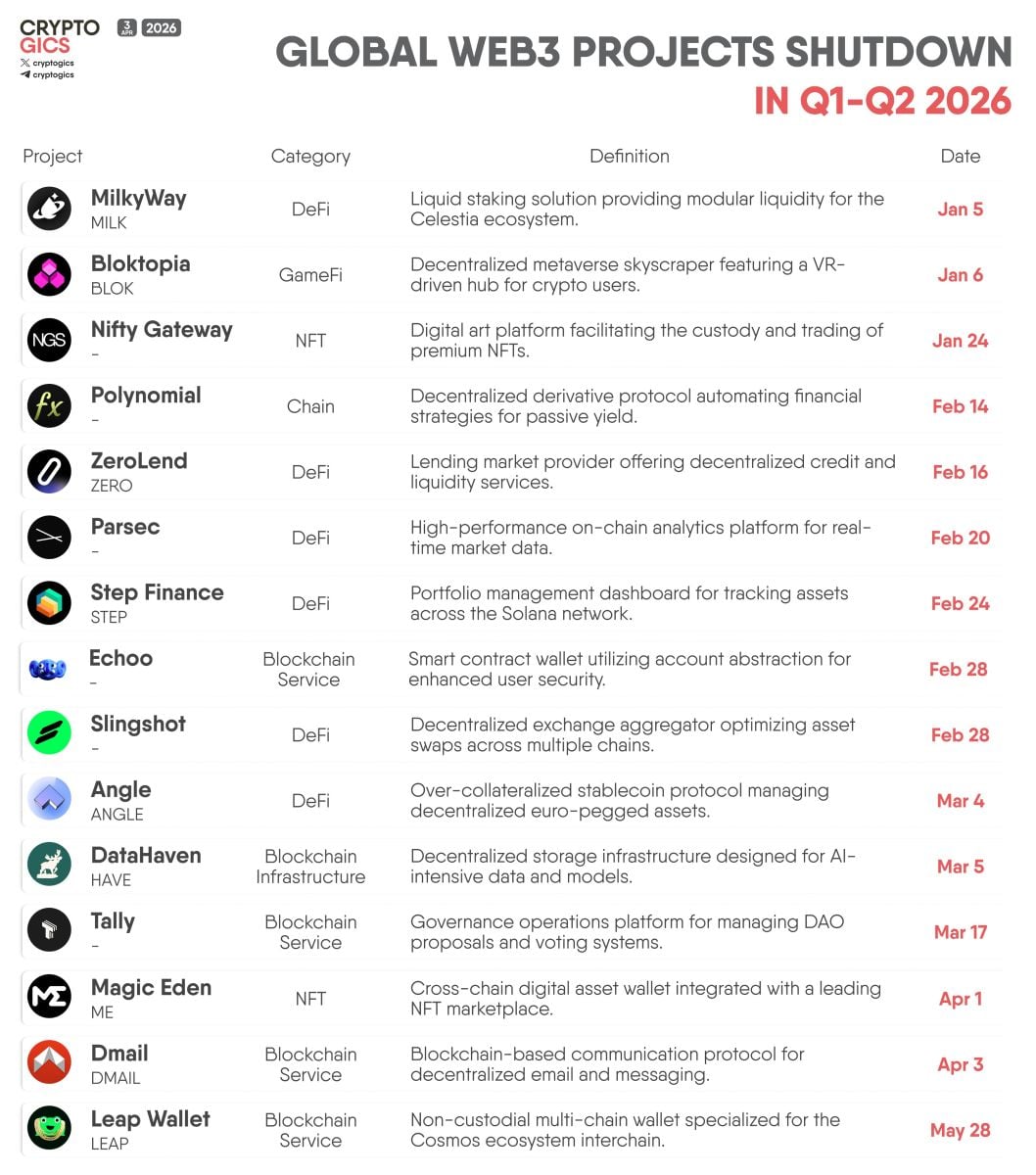 Рынок децентрализованных технологий проходит через этап жесткой консолидации. Согласно данным мониторинга Cryptogics, за первые четыре месяца 2026 о прекращении работы объявил ряд известных проектов в секторах DeFi, NFT и блокчейн-сервисов.