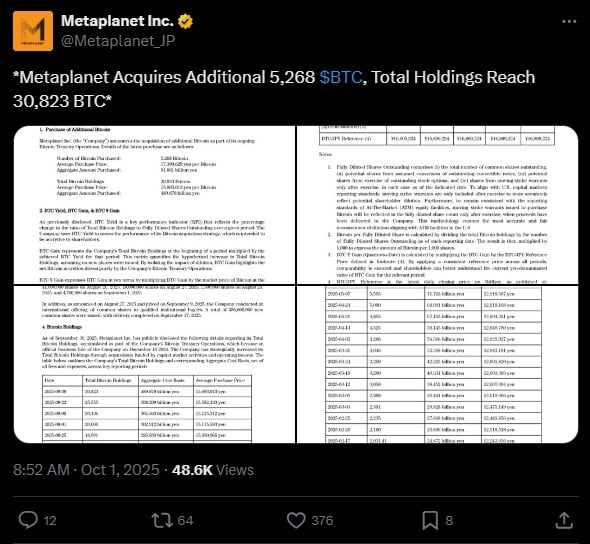 Эта веха уже была достигнута. 1 октября Metaplanet объявила, что в последние дни она купила 5268 BTC. После этой транзакции компания сообщила, что в своем портфеле уже 30 823 биткойновПолем Таким образом, указанная цель была достигнута.