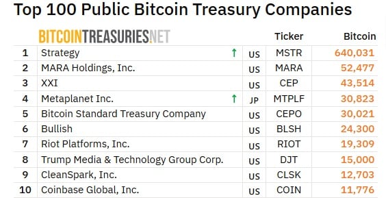 Эта транзакция означала, что компания уже продвинулась на четвертое место в списке крупнейших публичных компаний, которые есть у BTC. После недавних покупок японская компания подскочила в вышеупомянутом рейтинг биткойн -стандартной казначейской компании, за которым стоит Адам.